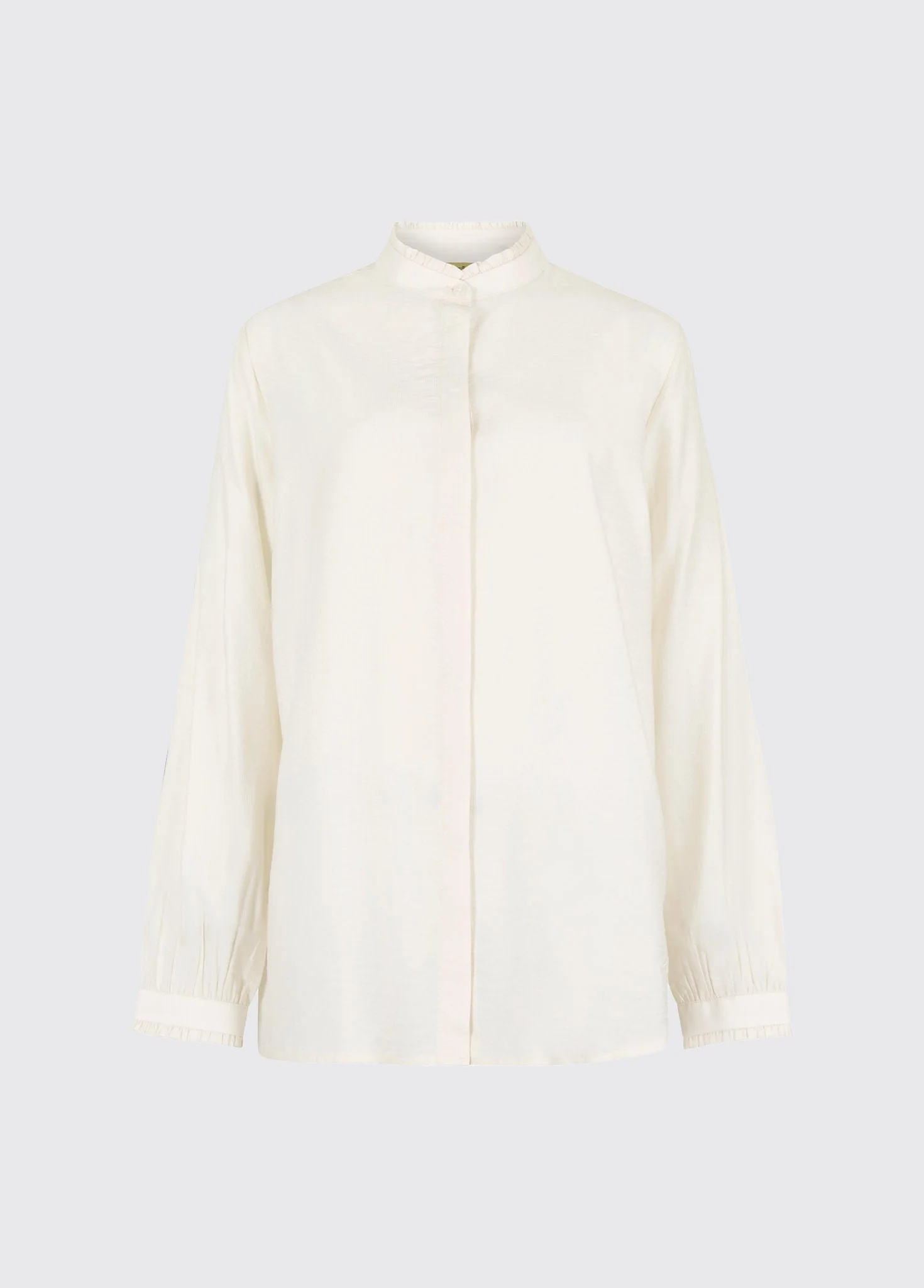 Elegant blus med volangdetaljer – tidlös sofistikation. En vacker och lätt blus med nätta volanger vid krage och manschetter som ger din outfit en elegant och sofistikerad känsla. Den längre längden och det mjuka materialet i rayonblandning gör att blusen faller smickrande på de flesta kroppstyper. Tack vare sin lätta kvalitet kan den bäras både instoppad eller utanpå linningen. Passar perfekt under en skräddad kavaj men är lika stilfull tillsammans med en stickad tröja.