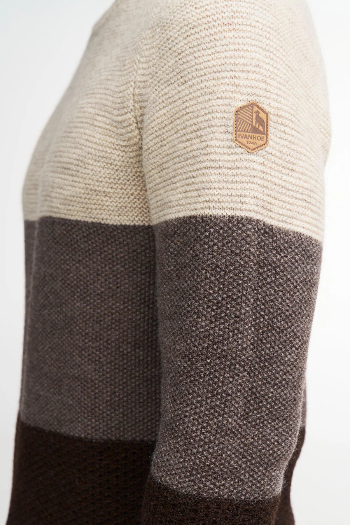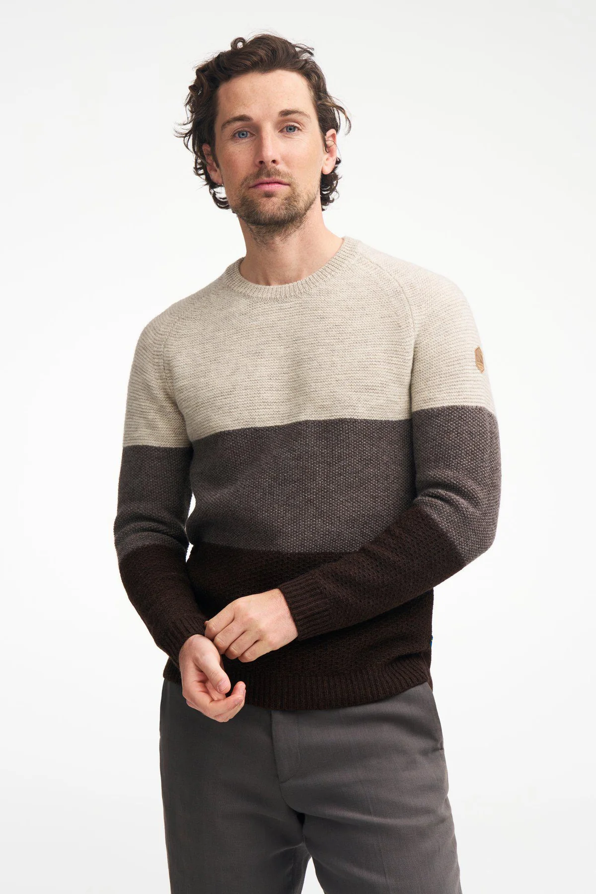 Rundhalsad tröja i 100% ofärgad, helt naturlig ull. Kul design där de olika färgblockan, förutom olika färg, även har olika stickstruktur. Upptill vänster ärm sitter vårt logomärke i jacron, ett läderliknande material framställt av cellulosa.