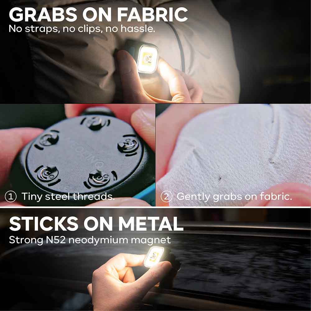 Light01 erbjuder frihet i alla ljusförhållanden. Bär den på ditt sätt. Lampan fästs enkelt på kläder eller utrustning utan remmar.