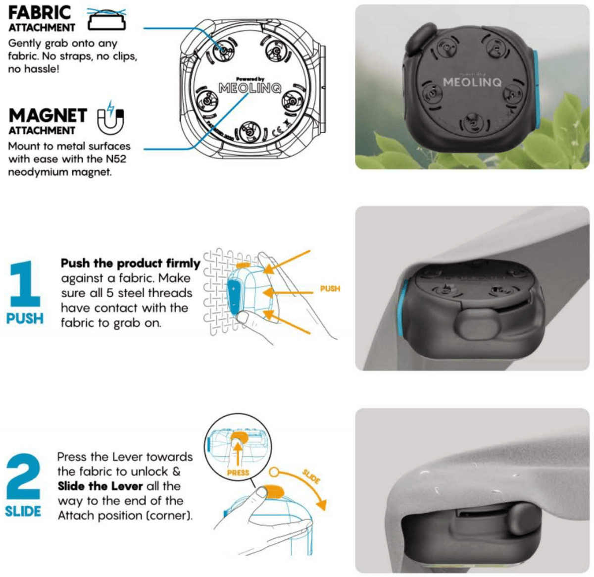 Dess patenterade och innovativa ståltrådsfästsystem som är en svensk uppfinning från MEOLINQ fäster ljuset som en tillfällig söm. Det kommer inte att skada tyger eller lämna märken.