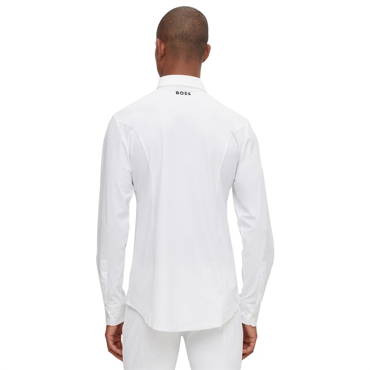 Den knappförsedda kragen ger ett traditionellt och stilrent tävlingsuttryck, medan de tekniska materialen säkerställer att skjortan sitter bekvämt även under längre tävlingsdagar. Den avtagbara slipsnålen och den kontrasterande BOSS-logotypen sätter en elegant finish.